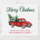 Helgdag-liquor-flaska-etiketter med moderna kalligrafiskript God jul med en vattenfärg klassisk röd lastbil, julgranar och snö.