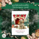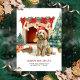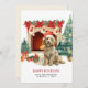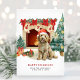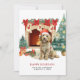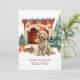 En söt vattenfärg Goldendoodle-hund julkort har söt vattenfärgsgrafik av en spiritad Goldendoodle inslagen i ljus nära en kamera och Julgran. Anpassa med din familj och hund's namn.