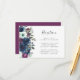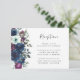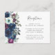 Det romantiska mottagningskortet för bröllop, som är lämnat kant, har en blommigt av plommon, marin blåa blommor och grönt. Rubriken "Mottagning" visas i handskriftsskript, med anpassadet text nedan i teckensnittet för kol-grått. Den omvända sidan har en koordinerande solid plommon.