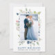 Elegant Watercolor Winter Grey och Blue Blommigt Glad helg Bröllop Photo Newlyged Helgdag Card omfattar botaniska grönjorda löv på vintern, blåbär, blåa blommor, bomull och röda bär. Dusty Blue och Silver Text.