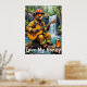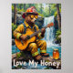 Den här charmerande teckningen har en björn klädd som brandman, komplett med hjälm och solglasögon, som spelar en akustisk gitarr medan den sitter på en fallande logg bredvid ett vackert vattenfall. En burk av honungen ligger i närheten. Bakgrunden visar att lush grey och det kaskadande vatten flödar in i en klar ström. Den målarande användan är tjock, texturerade penseldrag, ge ett vismiskt och hjärtskärande känsla, med "Kärlek My Honung" skriven nedan.