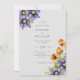 Färglöst bröllopsinbjudan med vattenfärgen vår blommor, t.ex. blue/ lila clematis och tulpaner i rött, gult och orange
