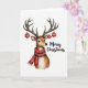 Gör någons helgdag ljusare med ett julhälsningskort med en charmerande vattenfärgsmålning av en hjort! 🦌 Denna beundransvärda hjort bär en mysigt röd och vit strimlad scarf och har elegant grått-antrar som dekorerats med tre vackra julprydnader. Hjorten står ut mot en enkel vit bakgrund och skapar designpopup-fönstret. Till högerna av hjort huvud står ord "God jul" vackert skrivet med svart kursivt typsnitt, vilket ger kortet en smula elegans. 🎅 🏼 🎁 Det här heliga kortet är perfekt för att sprida helgdag och varmt önskemål till dina kära!