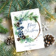Vattentäthetskort för julhälsning, vattenfärgad snöfläsk tallar-andedräkt med blåa vinterbär och gräs-koner, redigerbar mallinbjudan omedelbar nedladdning