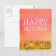 Ett vykort för söt under hösten med en rad klara orangar och vattenfärgade blommor med en röd, orange och gult vattenfärg tvättar bakgrund.