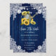 Rustiskt blått blommigt-bröllop spara datum-kort med en gammal vattenburk och solblommor mot en träbakgrund med vit blommigt snöre och snöre ljus.