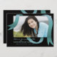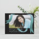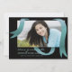 En modern inbjudan med ett tealblått band som hänger löst över ditt favoritfoto med en svart bakgrund.