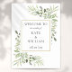 Med känsliga akvarellblad kan denna snygga välkomstskylt anpassas med din speciella bröllopsdagsinformation. Designad av Thisisnotme©
