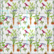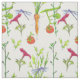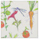 En trädgårdsmatad väv som dekoreras med ritpennor och bläck illustrationer av morötter och tomater med en blå drakfluga i färgpenna.