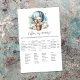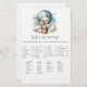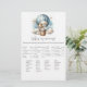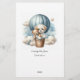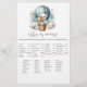 Äventyr temat "Vem är min Mamma", babyduschspel med en vacker vit valp som håller en nalle riden i en blå luftballong. Vattenfärgen blå himmel har vita moln med omgivande guld-stjärnor. Mallar på baksidan.