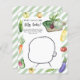 "Lokalt odlad baby är på väg". Fira med denna akvarell grönsak tema baby shower fest! Akvarell gurka, lök, aubergine, zucchini, gula och röda tomater, rädisor, morötter, hetpeppar, söt gul peppar, ärtor och kål, broccoli och rödbetor på en skärbräda. Akvarell ekologisk skörd.