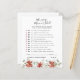 Det här spelkortet för baby shower-firande har vackra, mjuka akvarell vinterblommor i röda och vita nyanser som balanseras med frodig grönska, vilket ger en varm och luftig palett. Ändra bakgrundsfärg eller lägg till grafik för att matcha er shower-tema. Behöver du matchande grafik? Kontakta mig för en specialbeställning. Naturligtvis är det inte nödvändigt att ni spelar spel på baby shower-firandet, men tänk på det här: Ni kommer att ha en grupp med människor i alla åldrar, och de flesta av gästerna har förmodligen aldrig träffats tidigare. Att blanda in några av dessa klassiska baby shower-spel är ett perfekt sätt att bryta isen. Dessa professionellt designade kort kan snabbt anpassas.