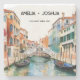 Denna bröllopsunderlägg visar en pittoresk vy över Venedig, Italien, vackert återgiven i akvarell på framsidan. Mot en bakgrund av lugna kanaler och charmerande venetiansk arkitektur fångas essensen av stadens romantiska lockelse i varje penseldrag. Gondoler glider graciöst längs de stilla vattnen, medan historiska byggnader med utsirade fasader står högt under den varma medelhavssolen. I elegant scriptstil pryds orden "Spara datum" överst på kortet, med mjuka kurvor som speglar de flödande kanalerna i Venedig. Under brudens och brudgummens namn är fint sammanflätade, skrivna med en känsla av ömhet och kärlek. Under deras namn visas bröllopsdatum med subtil sofistikation, vilket markerar det