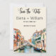 Kortet "Spara datum" presenter är en bild av Venedig, Italien, som återges vackert i vattenfärg på framsidan. Mot bakgrund av serenkanalerna och den charmerande venetianska arkitekturen fångas kärnan i stadens romantiska allure i varje borstdrag. Gondolas gländde på ett skonsamt sätt längs det stilla vatten, medan det historiska byggnad med sina ornerade fasader står högt under det varma Medelhavets sol. I elegantens skriptteckensnitt är ord "Spara datumet" överst på kortet, deras vackra kurvor som speglar Venedigs blomningskanaler. Nedan är namn på bruden och brudgummen tätt sammanflätade, skrivna med en känsla av ömhet och kärlek. Under deras namn visas bröllop-datumet med en nyktert sofistikering, vilket markerar det betydelsefulla tillfälle som väntar. När du viker över kortet visas en fängslande bakgrund av vattenfärgsplattor, som påminner om det krångliga mönster som finns på Venedigs gator och torg. Dessa plattor bildar ett gräns och ger utrymme för att bruden och rummets namn ska upprepas, den här gången i ett mer underskattat skriptteckensnitt. Under deras namn är bröllop-datumet elegant skrivet igen, och fullföljer inbjudan med en aning tidlös charm.