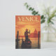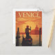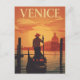 En romantisk reseaffisch vintage-stil som fångar ett lugnt ögonblick i Venedig, Italien. Bilden visar en gondolier som styrde sin båt på Grand Canal vid solnedgången. Den klassiska venetianska skylinen, inklusive den ikoniska domen av Santa Maria della Salute, är silhuetterad mot ett varmt, orange himmel och det glödande sol. Den här återdesignen är en perfekt för dem som har romantiska destinationer i kärlek, italiensk kultur och klassisk resekonst. Den frammanar en känsla av tidlös elegans och gör ett vackert decor biet.