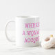 I den rosa texten står det: "Där det finns en kvinna finns det en prestation." O:n i citatet är faktiskt tecknet för Female.