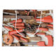 En samling gamla antika röda hanterade verktyg på en bord på en loppmarknad.