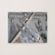 Denna Jigszawapussel har ett bild i verktyg som lägger ut på en loppmarknad bord med märkre på dem.