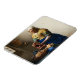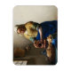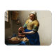 Johannes Vermeer The Milkmaid magnet. Oljemålning på canvas circa 1660. En vacker bild av ett nederländskt kök, Vermeer's The Milkmaid, fångar upp nordeuropeiska livet i mitten med nåd och behärskning. Mjölkstödet ölar mjölk från ett burk till en större pott omgiven av olika vågor av färskt bröd, en blå raps och en basket. Kvinnan bär själv en vit huvudduk, gult och blå och röd kjol med gröntens sleever. En underbar gåva till fläkt av Johannes Vermeer, Baroque-målning och nederländsk konst.