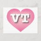 Det här vykortet har ett rosa hjärta med ett vitt tvättat centrum som innehåller det feta, vita, övre brev VT, officiell, förkortningen för Vermont, grönt bergsstat. Baksidan av vykortet är tom och väntar på dina handskrivna känslor eller anpassade texter.