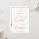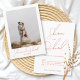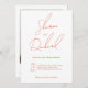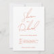 Modern och visuell Verona sunset orange skriver kalligrafi vit minimalistisk fallbröllopsinbjudning. Den här designen har en vit bakgrund och en vit skriptkalligrafi. Parets namn, elegant utvisad i detta blomstrande typsnitt, tillför ett personligt drag av artister och romantik och skapar ett minnesvärt första intryck för dina gäster. Baksidan har ett foto av paret.