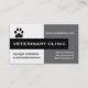 Vet/ Veterinary Clinic, tass öga-catch-affärskort grått, svart, vit, med tass i svart på grått, vit bakgrund och grått-band med texten Veterinary Clinic. En mall för anpassade för veterinärer eller husdjurskliniker/sjukhus.