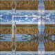 Två fotograferar taget under veteskörden som tillsammans kombineras för att göra ett intressant ovanligt naturligt kvartermönster för tyg. Perfekten för kudder, och den hem- dekoren projekterar. Vitmolnen mot blå himmel leker av de linjära mönstren av gulten, och bruntvete ror.