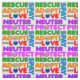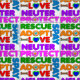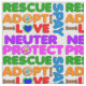 Färgfull rädda djuren-formulering, "spay, nyuter, adoption, skydd, rädding och kärlek", med tass och hund bengrafik.