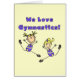 Två blonda haired stick figurflickagymnaster i purpurfärgade body och purpurfärgad text, som läser "oss, älskar gymnastik!", på flickagymnastTshirts hänger lös muggar, kort, klistermärkear, keychains och mer.
