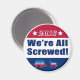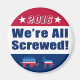 Inte lycklig med någon av kandidaterna till valet 2016? Då är den här designen till dig. Den här cirkelformade designen har röda, vita och blå delar. Den övre röda sektionen har år 2016 mellan två stjärnor i vitt, med blå konturer. I mitten av det vita avsnittet står det: "Vi är alla skruvade!" i röd text, och i den blå delen av grund har man en demokratisk åsna från stil och en republikansk elefant från stil i vitt.