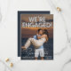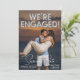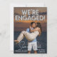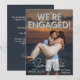 Denna Spara datum för bröllopsinbjudan har en rolig och romantisk design. Ett exempel på ett förlovningsfoto täcker bakgrunden, som du kan ersätta med ditt eget anpassade foto eller en annan bild som du väljer. Frasen "vi är förlovade" är tryckt i silverfolieballonger överst. Spara vårt datum för plats och dag är tryckt längst ner i en elegant vit font, med ytterligare text tryckt på baksidan av inbjudan.