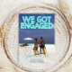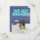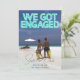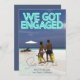 Denna Spara datum för bröllopsinbjudan har en tropisk och romantisk design. Ett exempel på ett förlovningsfoto täcker bakgrunden, som du kan ersätta med ditt eget anpassade foto eller en annan bild som du väljer. Frasen "VI BLEV FÖRLOVADE" är tryckt i teal eller akvafärgade neonljus över den övre delen för att efterlikna en neonskylt. Spara datum- platsen och dagen är tryckt längst ner i en elegant vit font, med ytterligare text tryckt på baksidan av inbjudan.