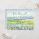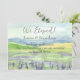 Ett elopement-meddelande som utmynnade i ett mjukt misterlandskap med lila vilda blommor som prickar det rullande backe och blå berg i avstånd. På motsatt sida finns en koordinerande skuggning av blått grått med utrymme för att redigera texten med dina detaljer.
