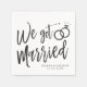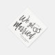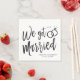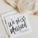 En rolig och unik manusbokstavad servett skräddarsydd specifikt för er efterbröllopsfest. Den har orden "Vi Gifta Oss" med vigselringar vilande ovanpå. Under detta och ovanför det står namnen på bruden och brudgummen samt förlovningsdatum.