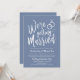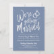 Efter den stora dagen och då ringarna är utbytta bjuder du in dina mest hedrade gäster till en efterfest. Denna inbjudan har orden "We're Getting Married" i prydliga skrivstilbokstäver över en bakgrund i duvblå färg. Mot sidan finns ett par vigselringar. Under denna unika grafik finns ett utrymme för dina egna ord och information om din efterfest.