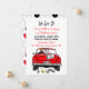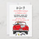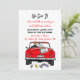 Vintage cabriolet med brud och brudgum och nygifta skylt med konservburkar hängande från bakdelen av deras bil när de kör iväg efter bröllopsinbjudan.