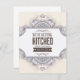Benvit bakgrund med en dekorativ, ramad vit mittpunkt. I dekorationerna ingår lilaska dammar och den blomstra mönster-omgivande mittpunkten ram med centrerad llac krona överst och grund. Typografiktext i brunt med anpassningsbar datum i lilac.