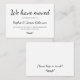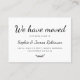 Enkel minimal "Vi har flyttat"-kalligrafiskript Nytt Flytta av hemmiljö, inmatningskort för bilaga. Låt dina vänner och din familj få reda på din ny adress genom att använda dessa minimalistkortsformat för elegant med teckenskript, typografi (eller kalligrafi) "Vi har Flyttat" text på framsidan och baksidan "Var vänlig och behålla vid beröring!" i svartvitt. Enkel att anpassa med din egen information.