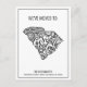Skicka din familj och dina vänner det här moderna boho South Carolina-statliga nya adress flyttans vykort. Den här eleganten har en svart och vit illustration av tillståndet i South Carolina, som accentueras av en blommigt mandala. Kortets överkant lyder "Vi har flyttat till:" och under illustrationen är ditt namn och nytt adress att anpassa. Baksidan av vykortet innehåller ett meddelande och namnteckning för att du ska kunna anpassa det. Designad av Susan Coffey.