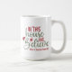 Den här söta personligen julkaffet mugg har talesättet "I detta hus tror vi" i färgen av rött och grönt och en söt julhatt och stjärndetaljer. Lägg till din familj namn eller personliga text för att göra mugg unikt.