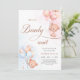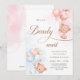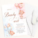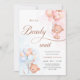 En nalle med temat baby gender visar en partiinbjudan. Den bruna typograftexten i eleganten lyder "vi kan vänta tidigt", på en blå och rosa vattenfärgsbakgrund i stänk, med nallar som flyter bort med blå och rosa ballonger.