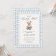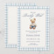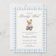 Denna blå gingham-björn bebisshower-inbjudan har en klassisk saga-stil björn iklädd en mjuk blå dräkt, inramad av en tidlös blå och beige gingham-kant. Den eleganta texten ”We Can Bearly Wait” skapar en lugn, traditionell känsla perfekt för att välkomna en babypojke.