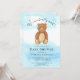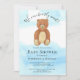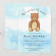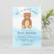 Denna söta pojkväninnors barnkalasinbjudan är dekorerad med en akvarellbjörn på en blå himmel bakgrund med orden "vi kan knappt vänta!"