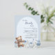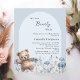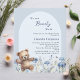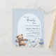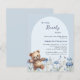 Vi kan vänta på inbjudan till Baby Shower. En ljusblå bakgrund med en båge. Dekorerad med vattenfärgade vilda blommor i blått och lycklig i nalle. 1 lakan = 1 inbjudan tryckt kant till kant.