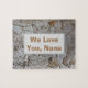 "Vi Kärlek You Nana" är känslan på personligens pussel. Bakgrunden har ett träd-barkfoto som visningar en abstrakt mönster. Trädens ljusa grått-bakgrund är prickad och snurrad med gyllene och röda prickar tillsammans med böjt linjer i mörk grått. Mittpunkten i det här strålpusslet är en lätt grått-rektangel som ger den solida bakgrunden färg för "We Kärlek You, Nana", som lätt kan anpassas efter dina behov i kostym.