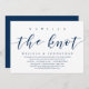 Modernt skript Klassiskt marinblått tema, bröllopsinbjudningskort (Vi Knöt Knuten). Det är perfekt för din informella bröllopsfest vid sjön.