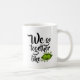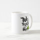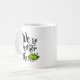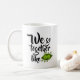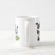 Svart text på en vit mugg som lyder "vi passar ihop som" och längst ner till höger syns två söta gröna ärter i en balja.