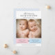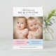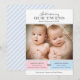 Meddela dina tvillingpojke och -flicka med detta eleganta "Vi presenterar Våra Tvillingar" födelseannonskort med foto. Ett nyfött foto visas ovanför rosa och blå namnbrickor som visar varje babys namn, födelsetid, vikt och längd med en grå hjärtaccent mellan dem. Baksidan har ett koordinerande rosa och blått diagonalt randmönster. All text och färger är helt anpassningsbara.