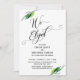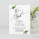 Med hjälp av en elegant, virvlande modern script-font har jag skapat ett grafiskt överlägg som lyder "We Eloped", för att komplettera det sofistikerade, versala serif-teckensnittet som används för dina detaljer. Samma "fancy-font" användes för att placera ordet "Love" på baksidan. Texten kompletteras av enkla, gröna akvarellblad som flankerar varje sida, topp och botten, fram- och baksida. Alla lager lades till separat och lämnades olåsta för att ge dig betydande designkontroll; gör de ändringar som behövs för att skapa det kort du föreställer dig. Rotera bladen, förstora eller förminska deras storlek för att bättre passa din text, ta bort dem från baksidan om du föredrar det... gör dem till dina egna! Och tveka inte att höra av