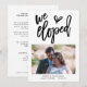 Ett elegant sätt att låta dina vänner veta om din rymning och bjuda in dem att gå med dig för en efterbröllopsfirande också! Stilfull skript Vi Rymmer står på framsidan i svart, under vilken du lägger till ditt favoritfoto från ditt bröllop, och anpassar dina namn, datum och plats för din ceremoni. På baksidan kan du enkelt anpassa med din underrättelse och inbjudan detaljer.